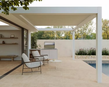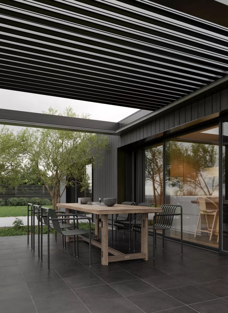 A Bioklimatikus Pergola széles fesztávon és mélységben egyetlen modulként alkalmazható
