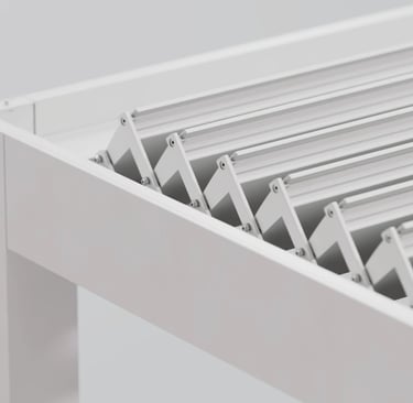 Az Albert Genau Bioklimatikus Pergola gondosan megtervezett sín- és panelmechanizmusokkal van felszerelve.