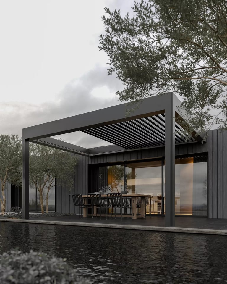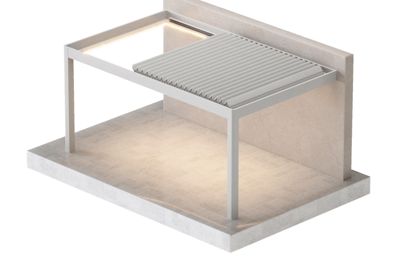 A Bioklimatikus pergola alumínium lamellákból álló tetőrendszer, melyben ennek a tetőrendszernek a lamelláit egy távirányítós motor mozgatja.